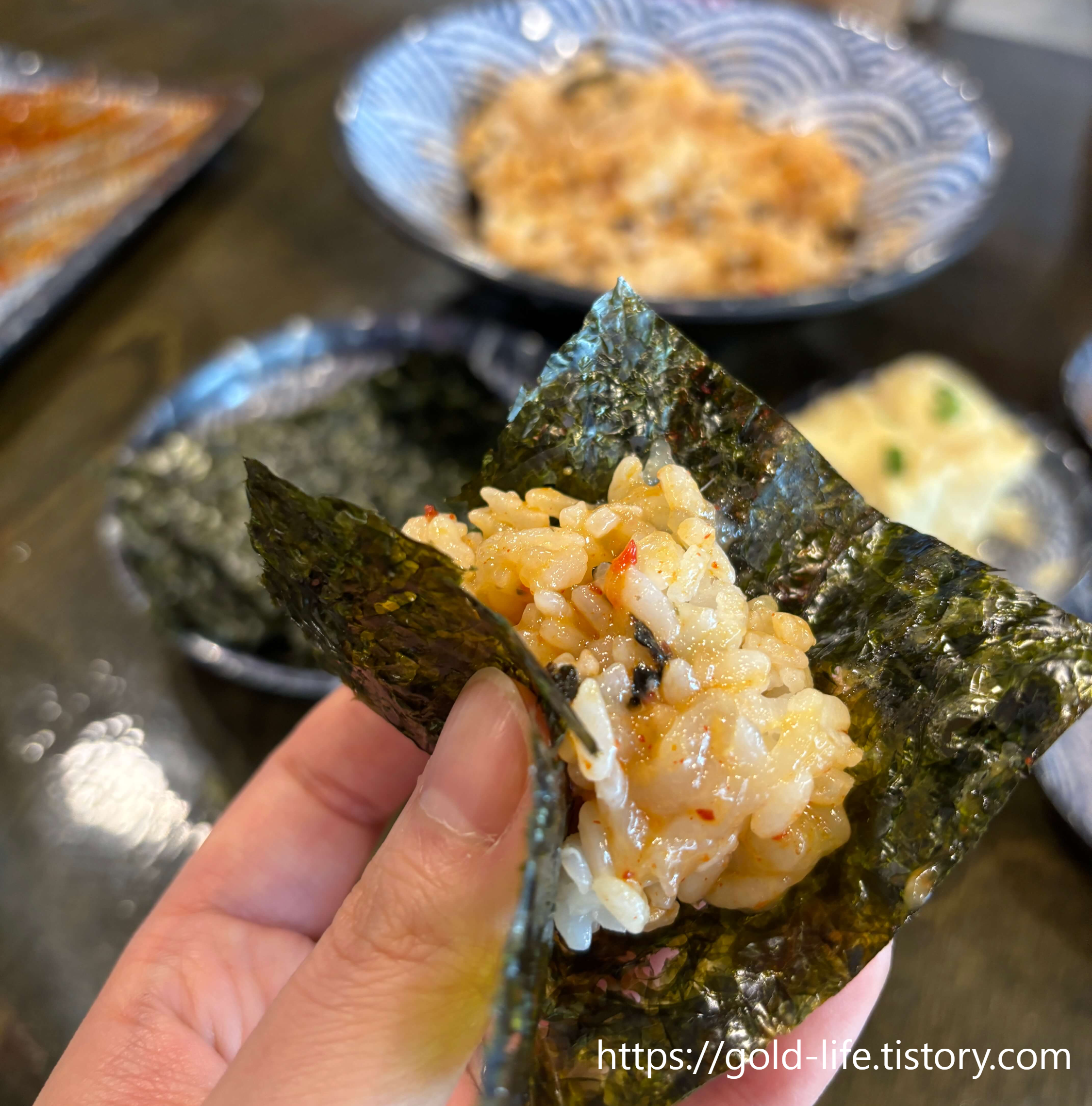 덮밥처럼 위에 얹어 먹어도 되고, 저처럼 비벼서 김에 싸드셔도 정말 맛있어요.