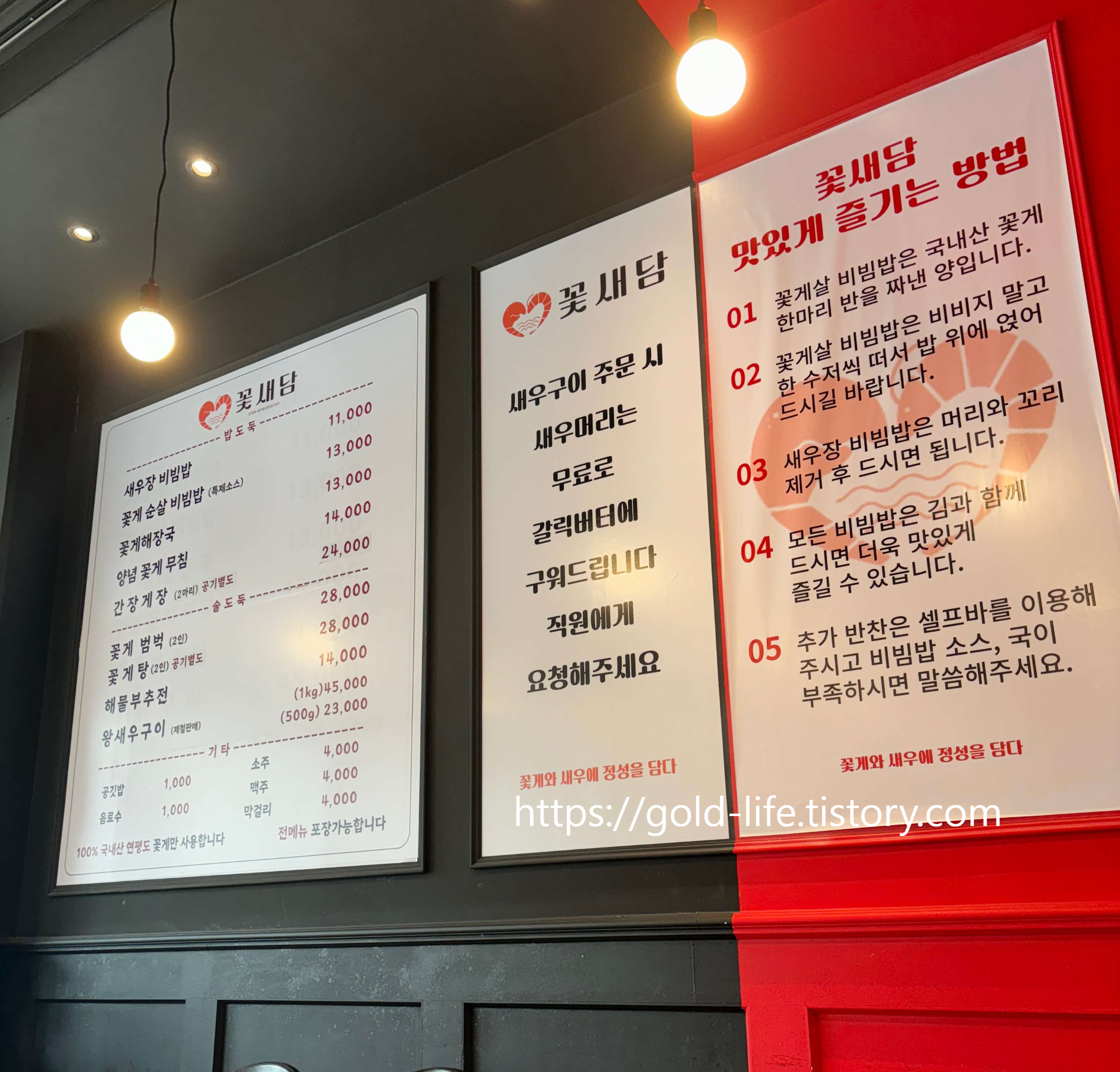 꽃새담은 꽃게와 새우가 주로 이루어진 식당이에요.